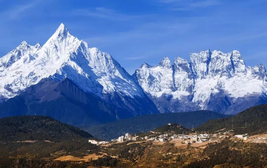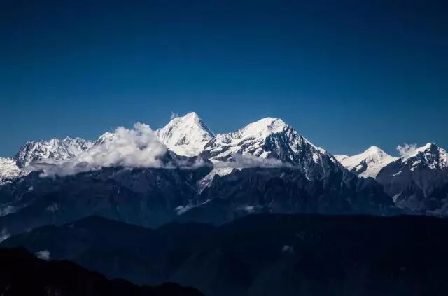贡嘎山终年积雪覆盖,晴空万里时,闪耀着熠熠光芒,瑰丽壮观。
