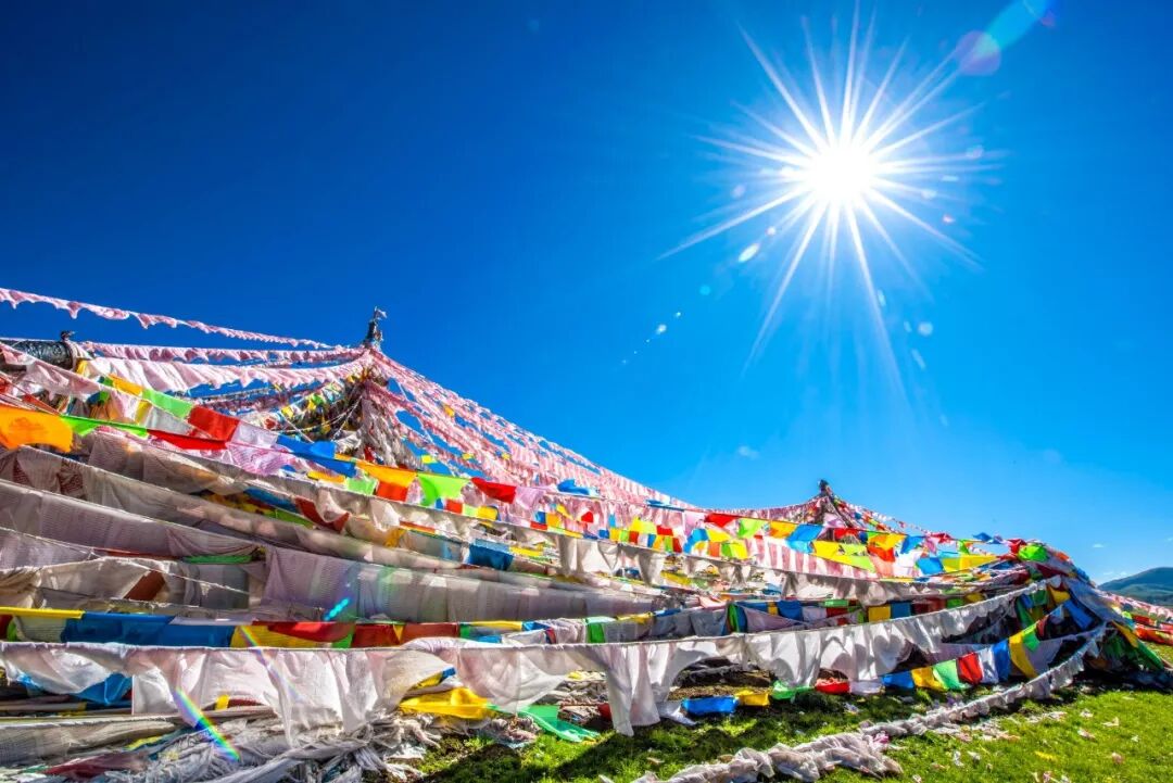 理塘河流淌其间,两岸分布着湿地和草场,每到夏季,湛蓝的晴空下,牛羊成群,绿草连天,遍地姹紫嫣红。