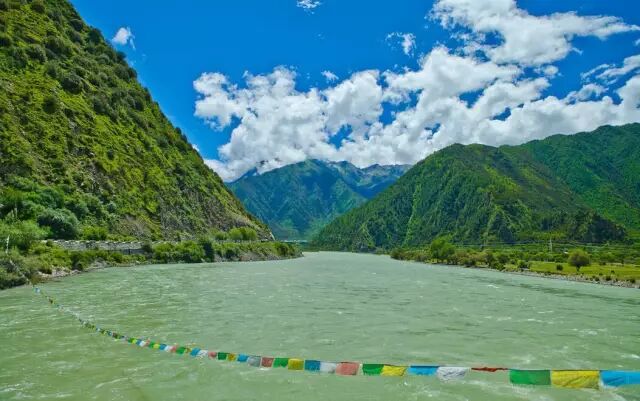 春夏时节的尼洋河桃花朵朵,绿树成荫,是一块流动的翡翠。 蓝天白云,云雾缭绕,河水碧蓝透底,沿岸有峡谷、河滩、藏式木屋、牛马,美不胜收。