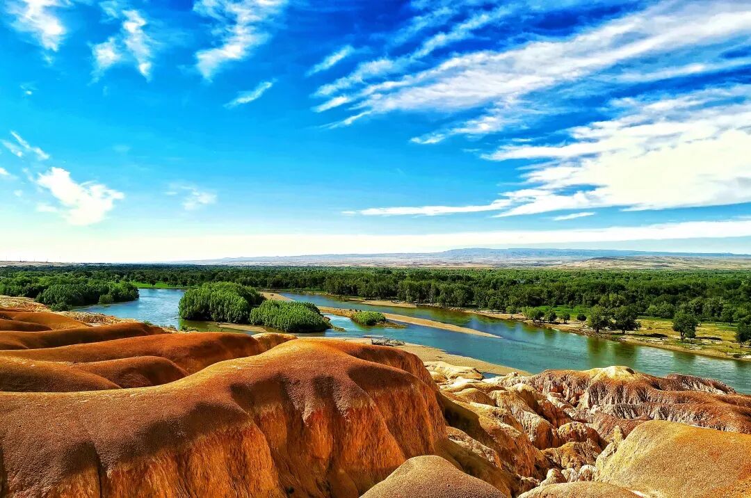 12:00 今日一站,号称“新疆最美雅丹地貌”【五彩滩】。五彩滩紧邻碧波荡漾的额尔齐斯河,与对岸葱郁青翠的河谷风光形成了鲜明的对比。五彩滩河岸是彩色斑斓、风景独特的熔岩地貌,由紫红、土红、浅黄和浅绿等泥浆、砂岩以砂砾组成,在河水的映衬和阳光的照射下五彩缤纷,十分壮观。
