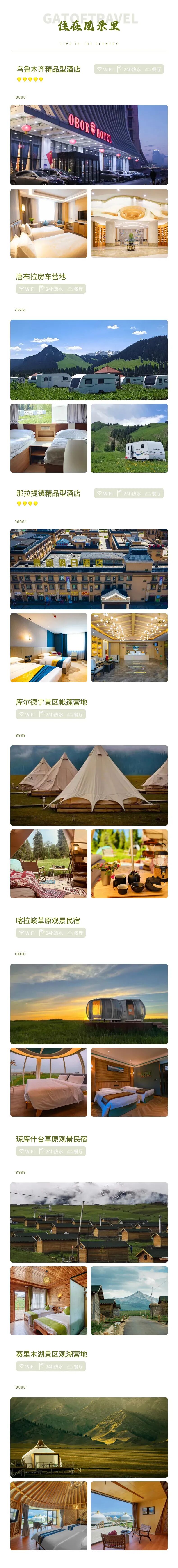 1、住宿:乌鲁木齐市精品型酒店双标间1晚,唐布拉房车营地1晚,那拉提镇精品型酒店双标间1晚,库尔德宁野奢帐篷营地1晚,喀拉峻草原观景民宿1晚,琼库什台观景民宿1晚,赛里木湖景区观湖营地1晚