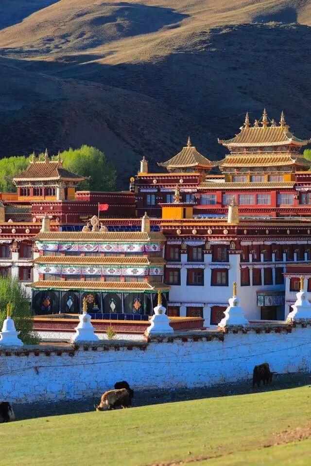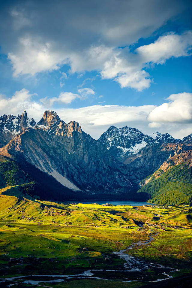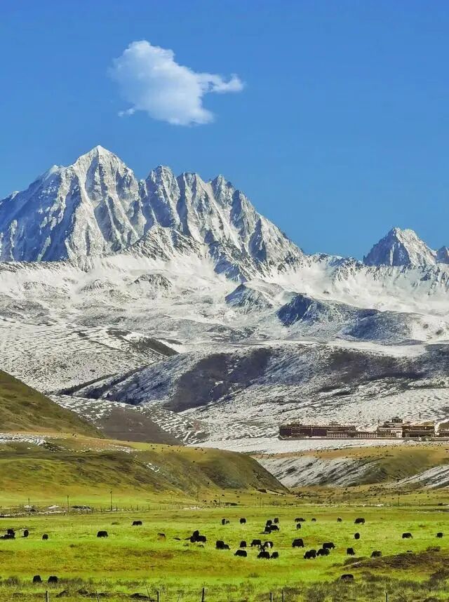 洁白的云朵无拘无束地飘荡在蓝色天幕之上,连接着白雪终年不化的尼特岗日峰,让人真切地感受到纯粹二字。蔚为壮观碧绿的章徳草原上夹杂着各色花朵,形态各异的奇峰怪石傲然屹立,最特别的当属传说中格萨尔王的化身——扎金甲博神山,将自然的大气磅礴表露无遗。