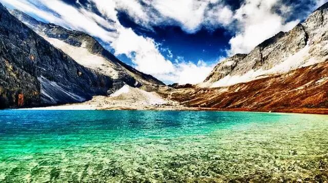 牛奶海,又叫洛绒措,古冰川湖,状如水滴,四周雪山环绕,湖水清莹碧蓝,山止成瀑,以其玲珑秀雅水色翠蓝而著名。