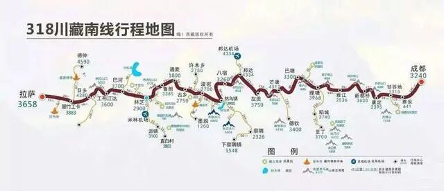 主要途经城镇:成都→雅安→康定→雅江→巴塘→芒康→左贡→邦达→八宿→波密→林芝→工布江达→墨竹工卡→拉萨