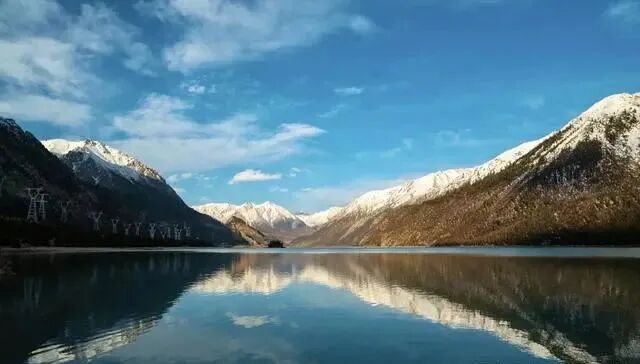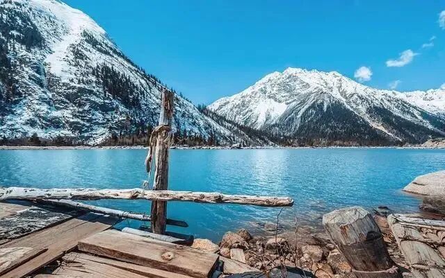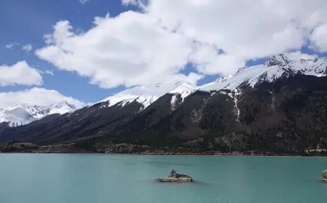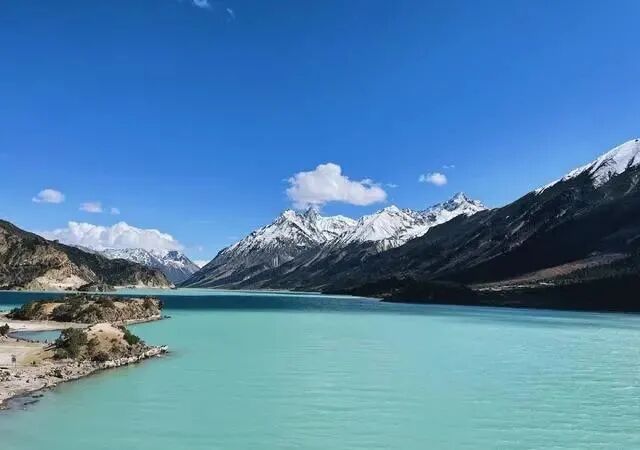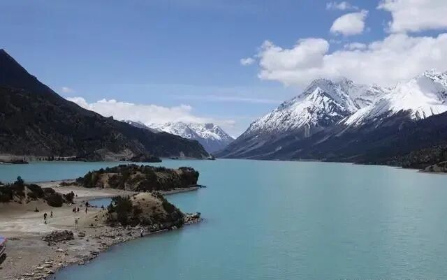 下游的冷安佳布湖既有青山绿水,又有雄壮的雪峰。金秋时节,景色层次分明,湖水清澈碧蓝,山脚是绿色,山腰呈金黄色,而山顶则是白雪覆盖,构成了一幅绚丽多姿的立体图画。很多游客一般游玩的是318国道旁边的然乌湖(冷安佳布措)。