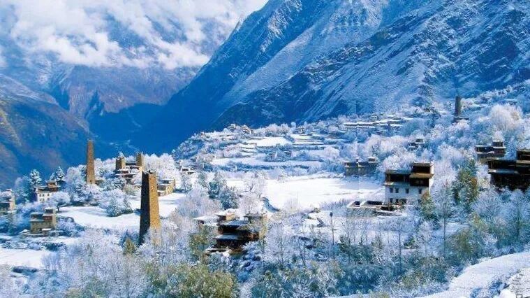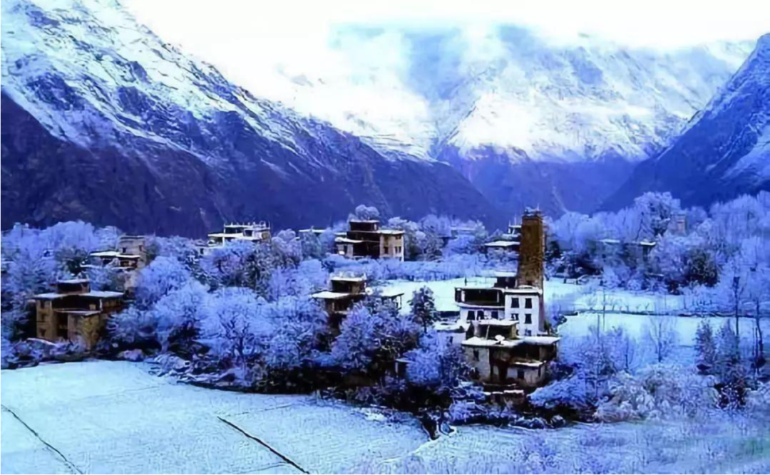 厚厚的积雪,过滤了一切杂音,唯有阵阵喜鹊的鸣叫回荡着。座座碉楼高高耸立,如同一个个严阵以待的卫兵,守卫者神山下幽静的村落。