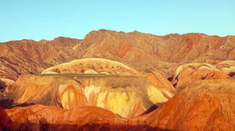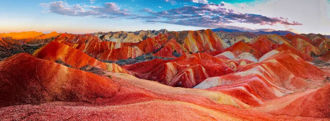 张掖七彩地貌发育于侏罗纪至第三纪的水平或缓倾的红色地层中,而彩色丘陵是七彩丹霞的核心组成部分,总面积为50平方公里,横跨临泽县与肃南裕固族自治县。彩色丘陵主要由红色砂砾石、砂岩和泥岩组成,地势平缓,山体纹理叠加有序,脉络清晰,色彩斑斓,呈现出波状起伏的丘陵形态。