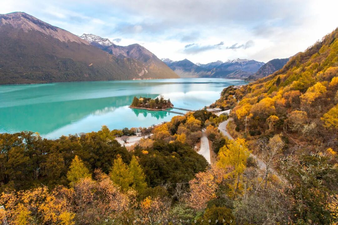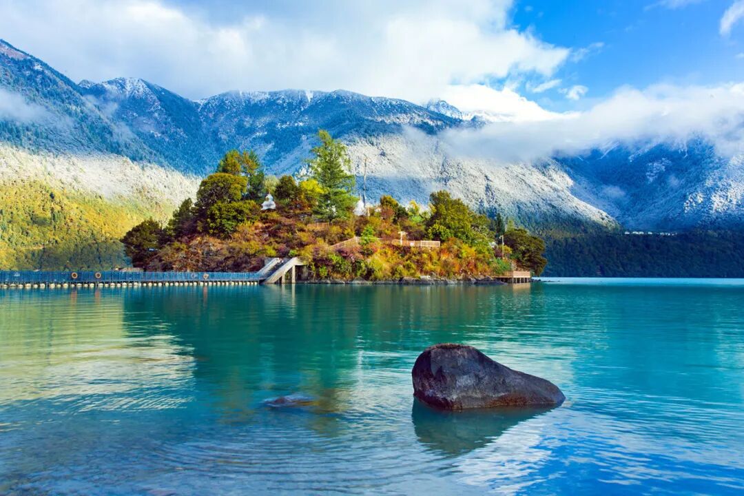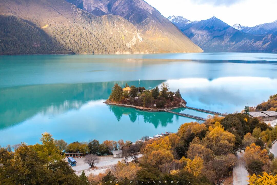 巴松措又称措高湖,藏语意为“绿水”。湖泊位于海拔3700多米的高峡深谷中,是林芝地区生态旅游资源最丰富、最集中的区域之一。冰雪融化形成的湖水清澈纯净,酷似帝王宝座的山体和喷发的火焰山构成了巴松措的主要景观,蓝天白云下的湖水清澈见底,远处的雪山和群山连绵起伏,周围的植被除了绿色外,还偶尔能看到黄色花与红色的叶。
