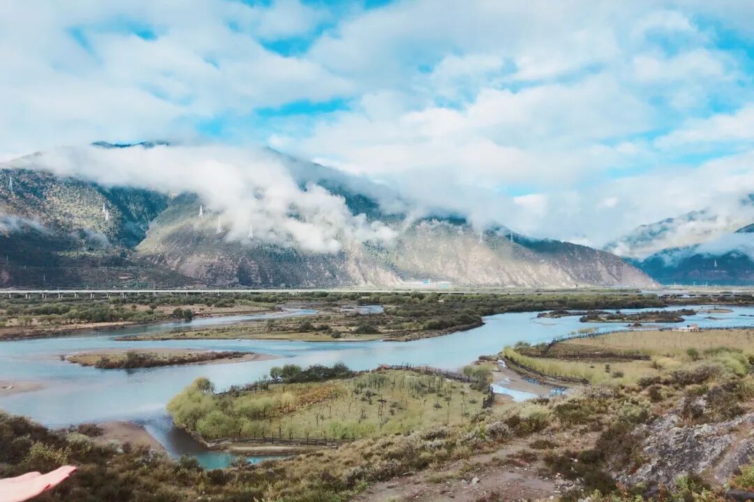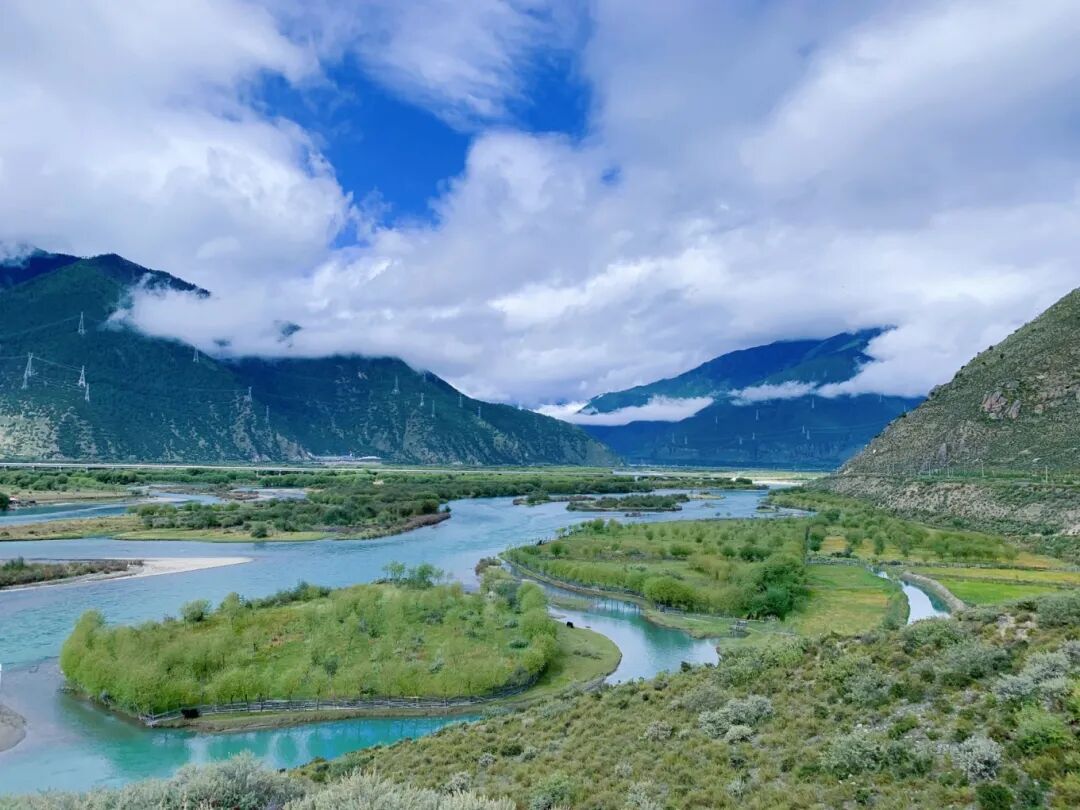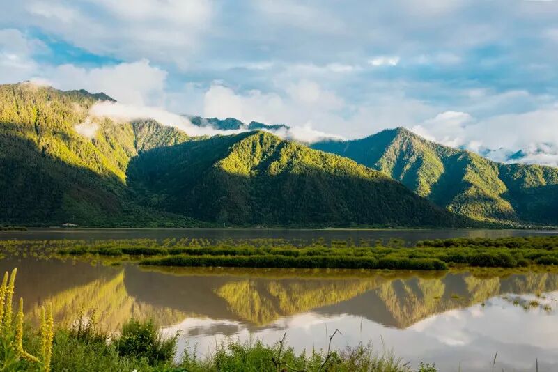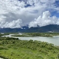 八一镇到直白镇修建了一条新的公路,这条紧邻河道的老路几乎被废弃,但沿途的花儿依然盛开,远处的山顶白云朵朵,人迹罕至,风景优美,随时可以驻足欣赏。即将转入大峡谷的尼洋河,此时河面开阔、沼泽遍布,河边的冲积沙丘洁白如玉,印度洋的暖风从墨脱峡谷吹来,吹绿了牧草。平静的水面上,湖光山色,云淡风清。眼前尽是一片藏区罕见的水乡美景。
