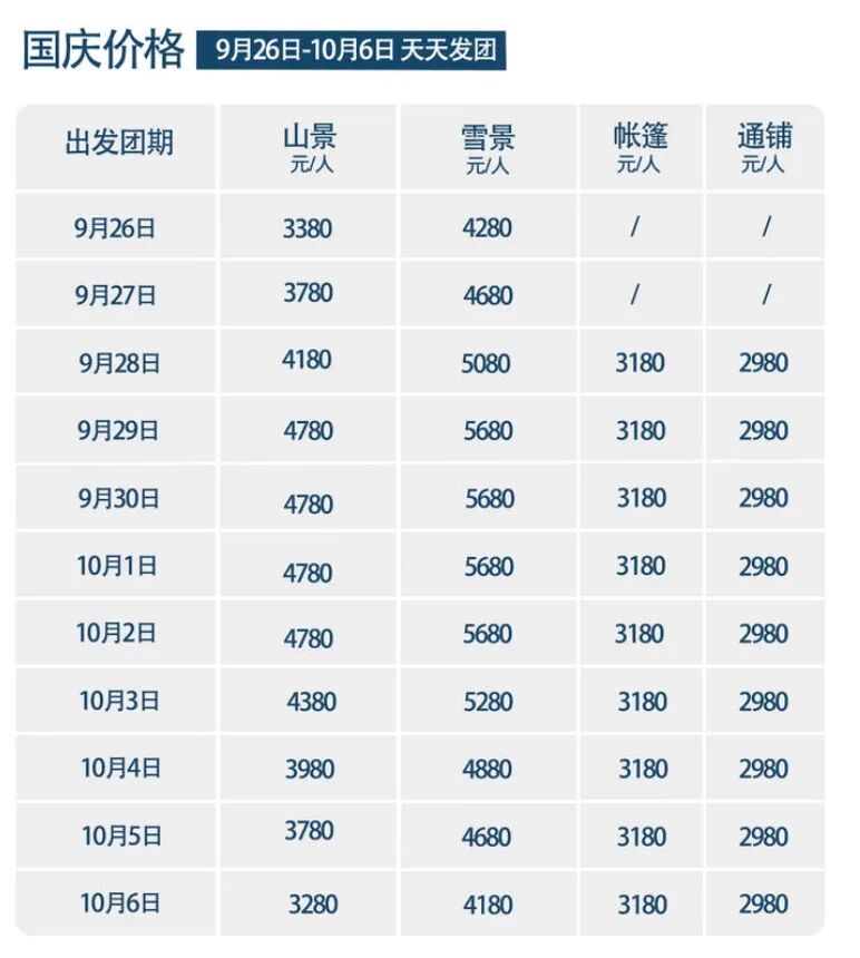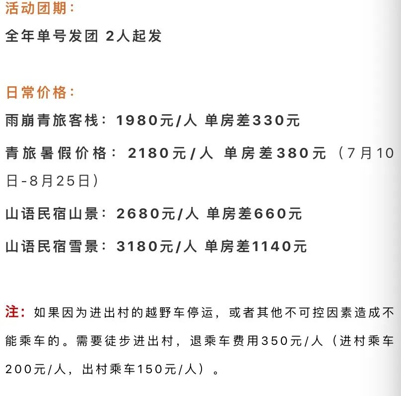 单房差:不收取自然单房差。我司按照报名顺序拼房,如最后没有同团的驴友一起拼房,我们则可能安排向导或其他团的同性客人拼房;未补单房差则默认为同意我司这样安排。主动要求单住需补房差630元/人;