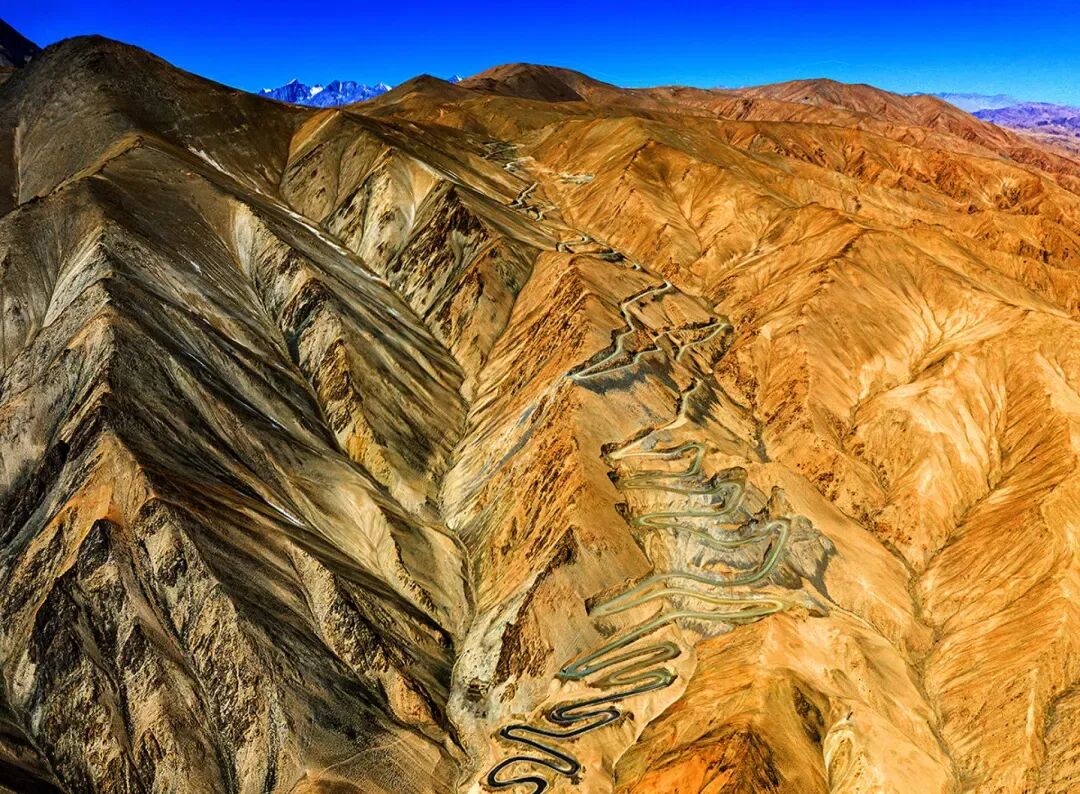 09:30我们抵达【盘龙公路】。全长75公里,有超过600个S的弯道;众多弯道180度,甚至270度,叫板怒江72道拐,完爆滇缅公路上的晴隆24道拐。盘龙古道如巨大的游龙一般,盘旋在约4100米的帕米尔高原上。黝黑的柏油路面的公路,与带着颜色的山体完美结合。蜿蜒曲折的道路,和壮阔的地址面貌形成了,一道别具一格的风景。
