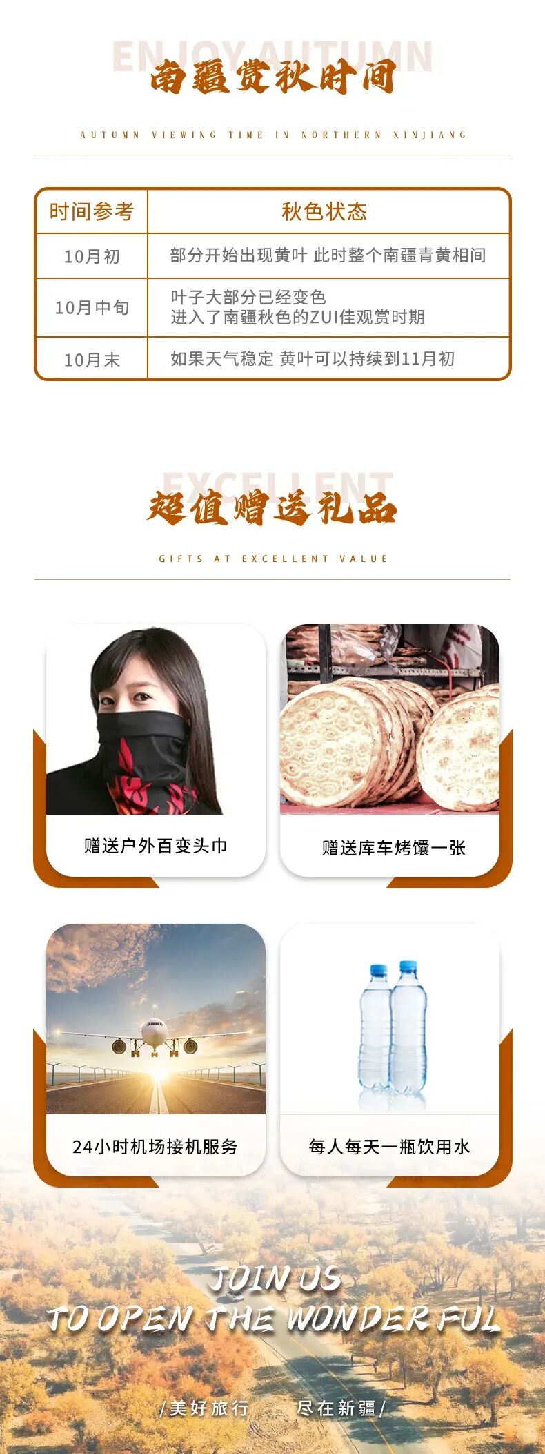 1. 南疆胡杨林最佳观赏时间在每年的10月15日左右,随天气变化而定。团期不能保证是最佳观赏期,请大家合理期待。