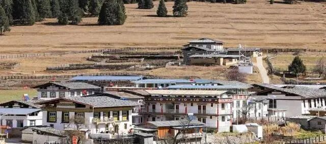 鲁朗扎西岗民俗村颇具森林特色的木栅栏、木板屋、木头桥、砖墙和农牧民的村寨,勾勒出一幅静谧优美的“山居图”。这就是传说中被文成公主称为“山寨”的扎西岗民俗村,当我们走出村子后,便来到了这片高山草甸。