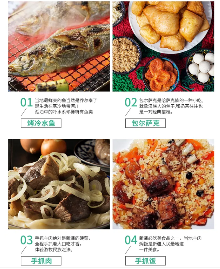 新疆特色美食推荐:手抓羊肉、手抓饭、烤馕、烤包子、馕坑肉、大盘鸡、椒麻鸡、烤包子、拉条子等。