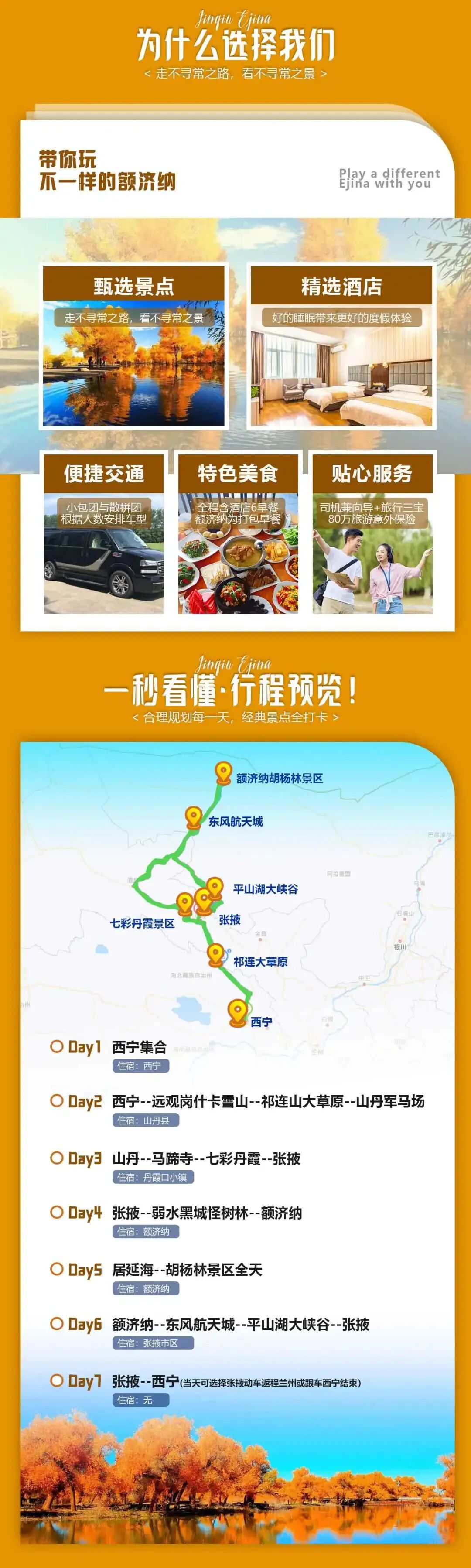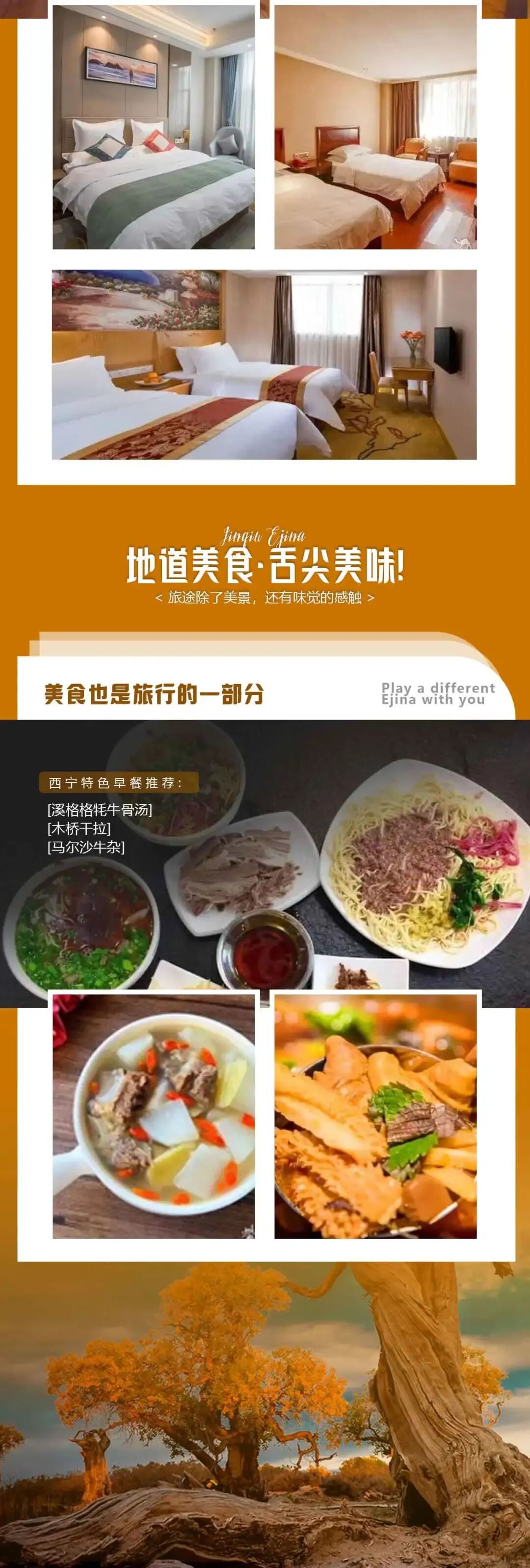 餐食:全程含酒店6早餐、额济纳为打包早餐。