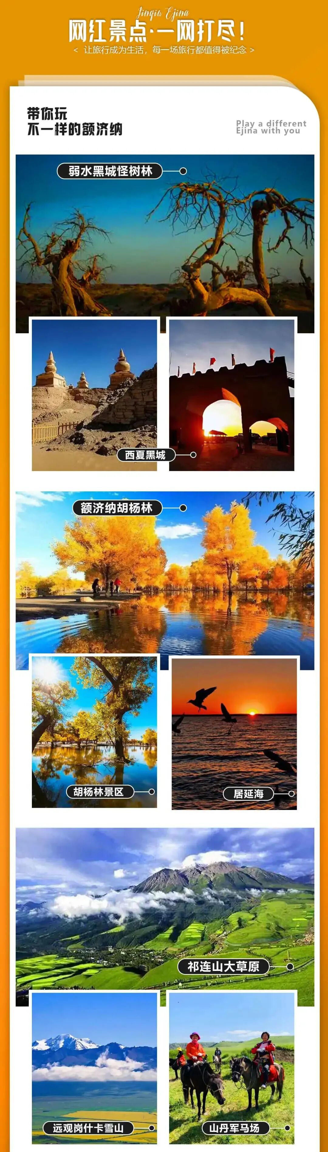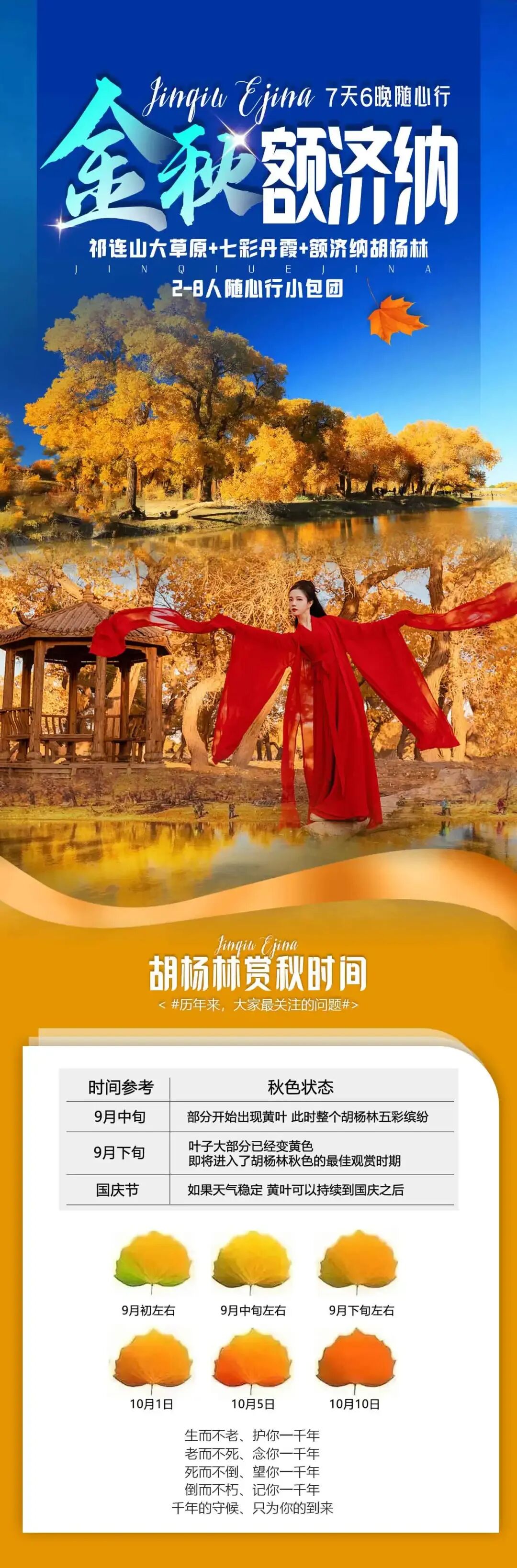 门票:额济纳胡杨林景区240元/人、大漠胡杨林景区150元/人,两个景区可根据客流量做二选一游览。