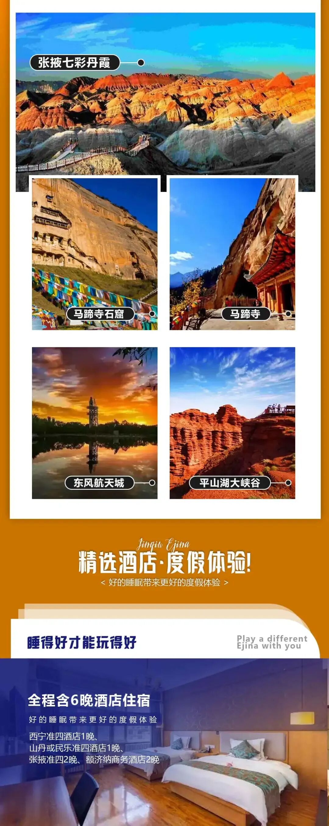 住宿:西宁准四酒店1晚、山丹或民乐准四酒店1晚、张掖准四2晚、额济纳商务酒店2晚,全程含6晚酒店住宿。