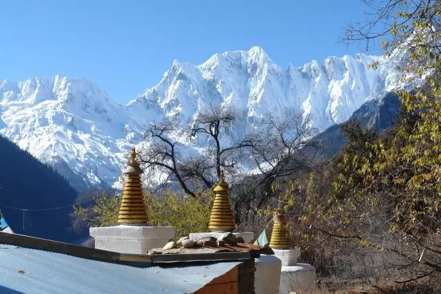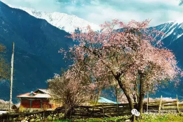 远处的冰川雪山,近处桃花遮掩下色彩斑斓的藏式房屋,形成强烈的视觉冲击。