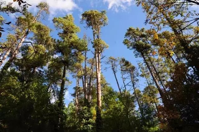 进入林内,可见树体下部枯枝脱落,宛如仙境中一片由巨型树干组成的清阔空间。