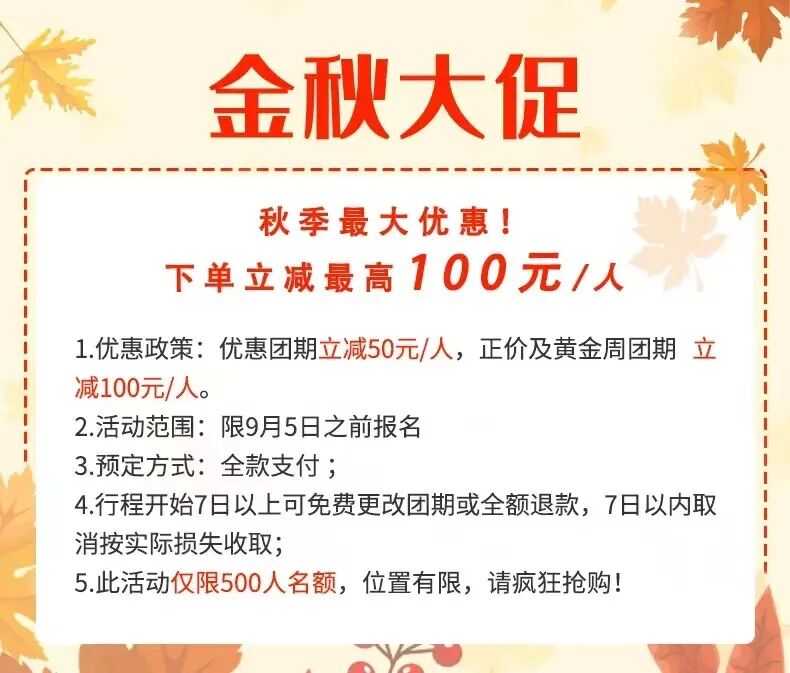 4、单房差:单人报名无特殊说明默认安排同性拼房,不收单房差,如需单住需补单房差,优惠团期单房差380元,正价团期为550元