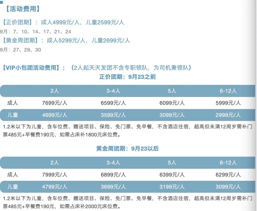 4、单房差:单人报名全程默认安排拼房,不收单房差(1大1小报名不保证拼房,未拼上房则需补房差),如要求单住需补单房差:正价团期1800元、黄金团期2000元。