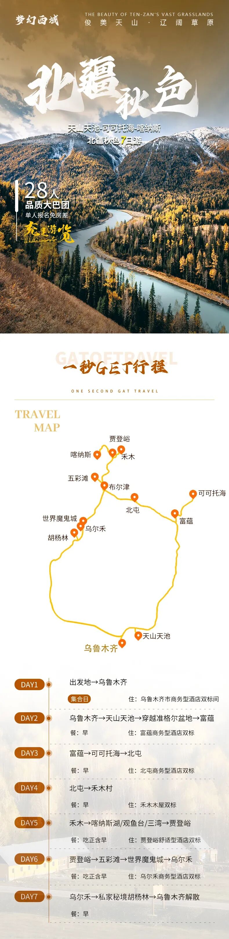 2、赠送户外百变头巾旅行三宝;3、特别安排小众秘境胡杨林
