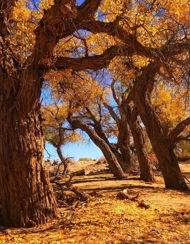 这里有着高达20多 m 、树龄超过百年以上的巨大胡杨树,它们像一把把金色塔楼耸立在黄沙之中。在这里拍下一张与巨树合影绝对是留念不可错过!