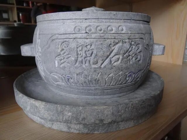 锅:源于西藏自治区林芝市墨脱县,墨脱是雅鲁藏布江流入印度前经过中国的最后一个县,这里直到2013年才通上公路。大家都听过这么一句话“要想富,先修路”可见墨脱的交通条件不易。石锅的前身是产于雅鲁藏布江两岸陡壁的悬崖上的天然皂石,后经中国辐射环境管理监测中心多位教授分析、检测,它富含“ZN锌、FE铁、CA钙、MG镁等多种对人体有益的微量元素。因为交通不便要整块将石头背出,辛劳可想而知。还有一些采石人直接在悬崖峭壁中凿石就地打磨,危险性极高。