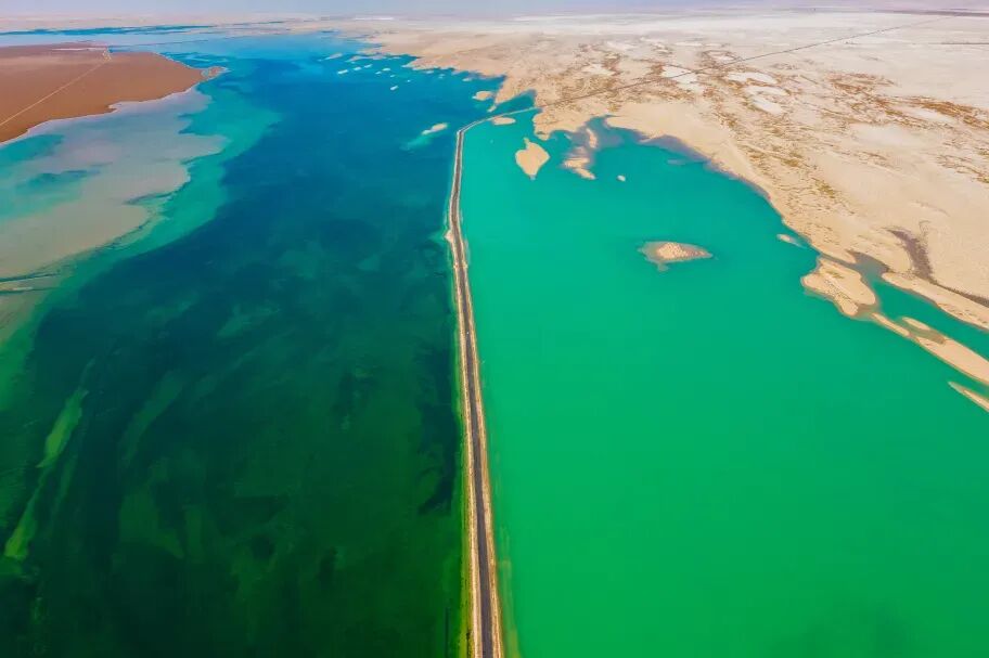 08:30抵达【西台吉乃尔湖】,因一条公路把湖水分开而得名,两边的湖水,一边绿色,