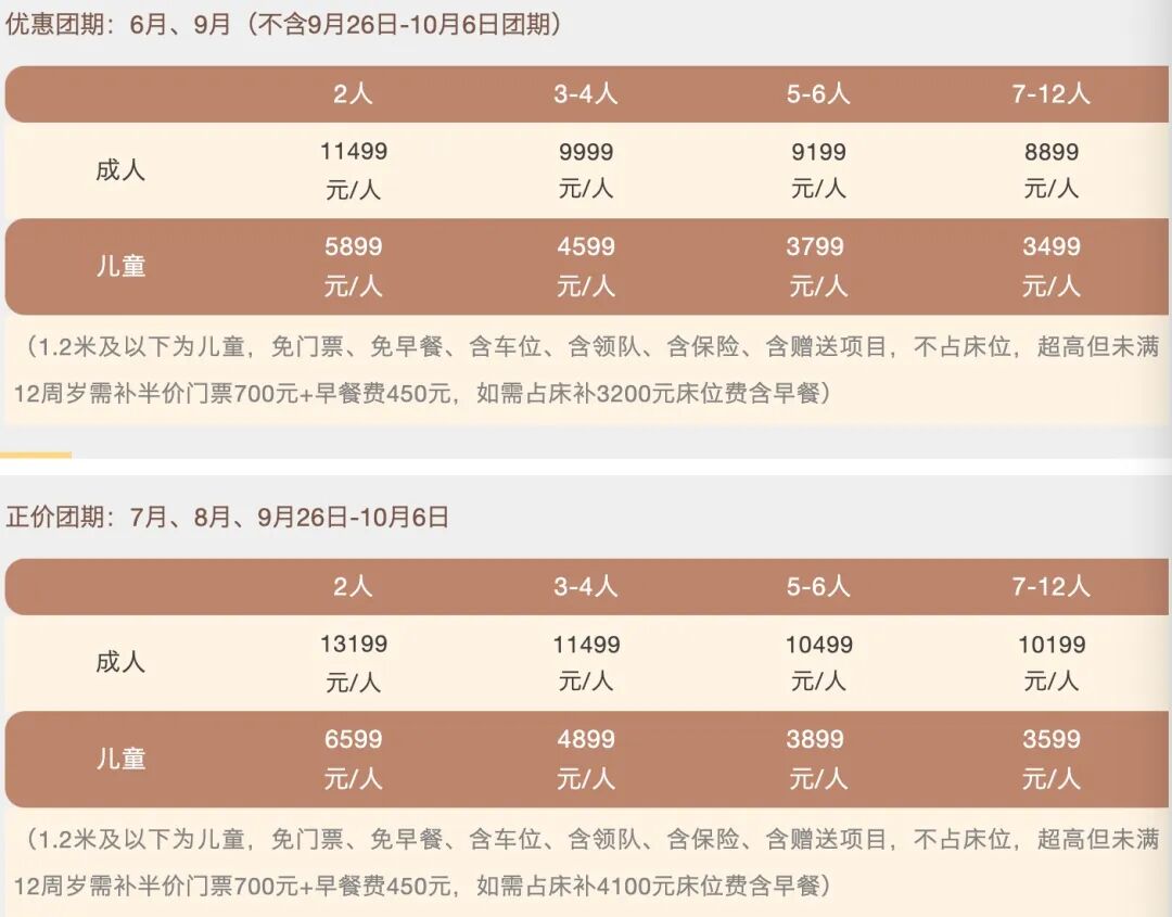 1.2米及以下为儿童,免门票、免早餐、含车位、含领队、含保险、含赠送项目,不占床位,超高但未满12周岁需补半价门票+早餐费,如需占床需要补床位费(含早餐)