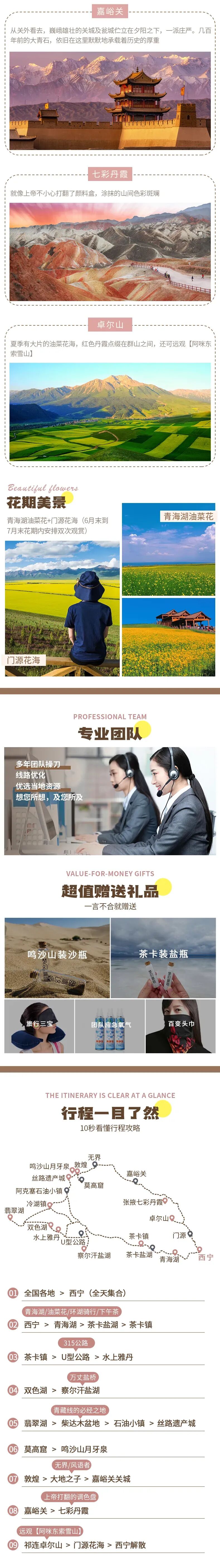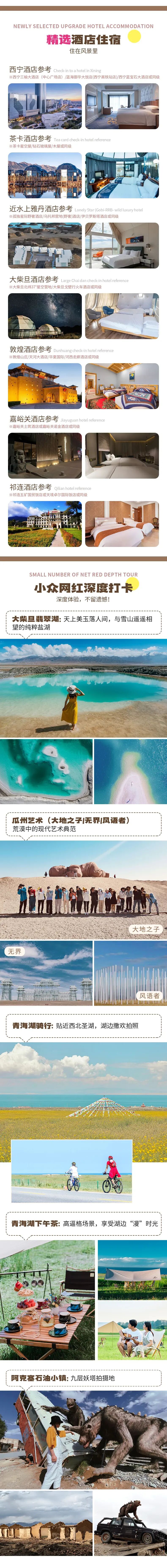 4、门票:青海湖门票、茶卡盐湖门票+景区往返小火车(青海省海西洲是浙江援建,浙江籍游客凭有效证件游览茶卡盐湖可免门票,现场退还门票)、翡翠湖门票+环保车、水上雅丹门票+环保车、察尔汗盐湖+环保车、石油小镇、丝路遗产城门票、莫高窟(莫高窟全票组成:门票180元/人+交通费10元/人+数字展示中心48元/人、莫高窟应急票组成:门票90元/人+交通费10元/人)、鸣沙山月牙泉、嘉峪关关城、七彩丹霞+环保车、卓尔山+环保车;