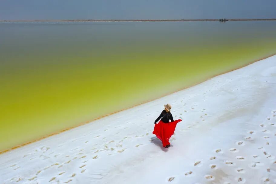 一边蓝色泾渭分明,因此这里也被称为双色湖,与天空相互映衬,水天相连,