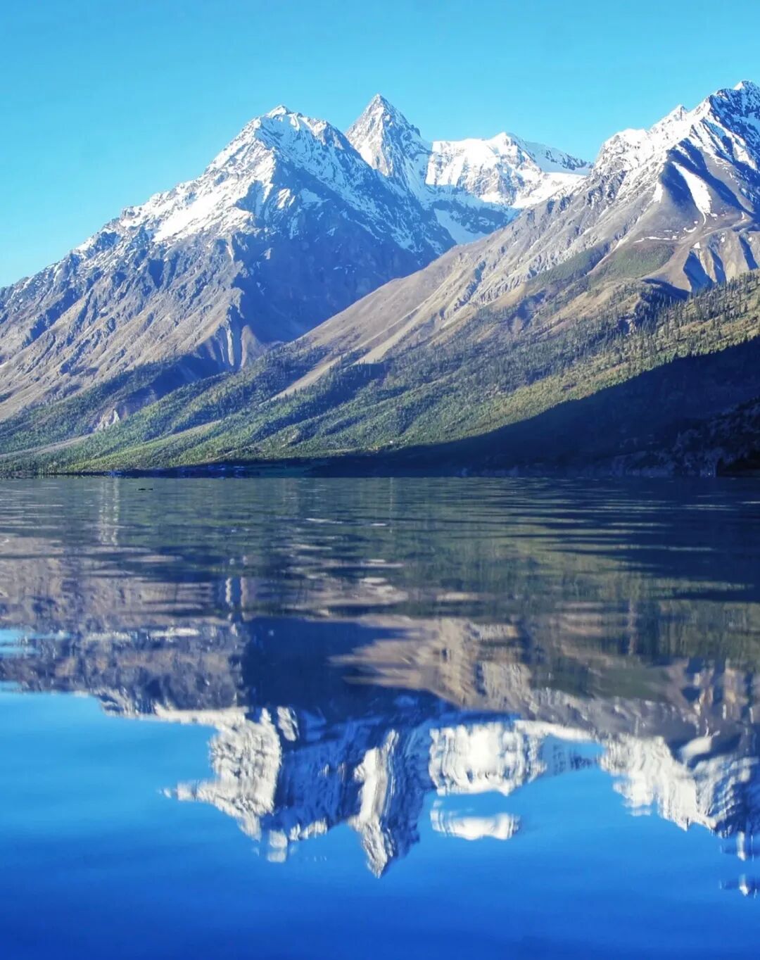 然乌湖湖面平静、湖水清澈见底,湖边芳草绿荫,和远处的森林和雪山相对应。如此美景,随手一拍,就是大片。