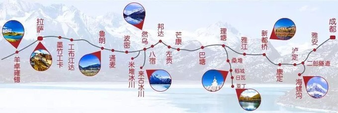 成都→雅安→泸定→康定→新都桥→理塘→巴塘→芒康→左贡→邦达→八宿→然乌→波密→通麦→鲁朗→墨竹工卡→拉萨