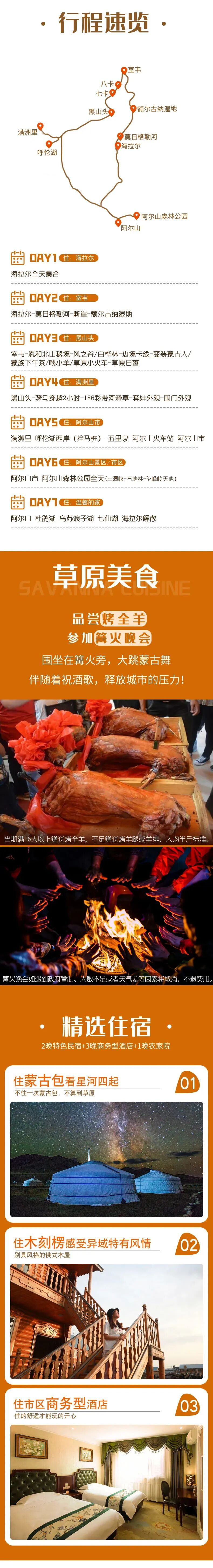 1、住宿:海拉尔商务型酒店标间1晚、室韦木刻楞标间1晚、黑山头观星蒙古包标间1晚、满洲里商务型酒店标间1晚,阿尔山市商务型酒店标间1晚、阿尔山景区家庭旅馆标间1晚;