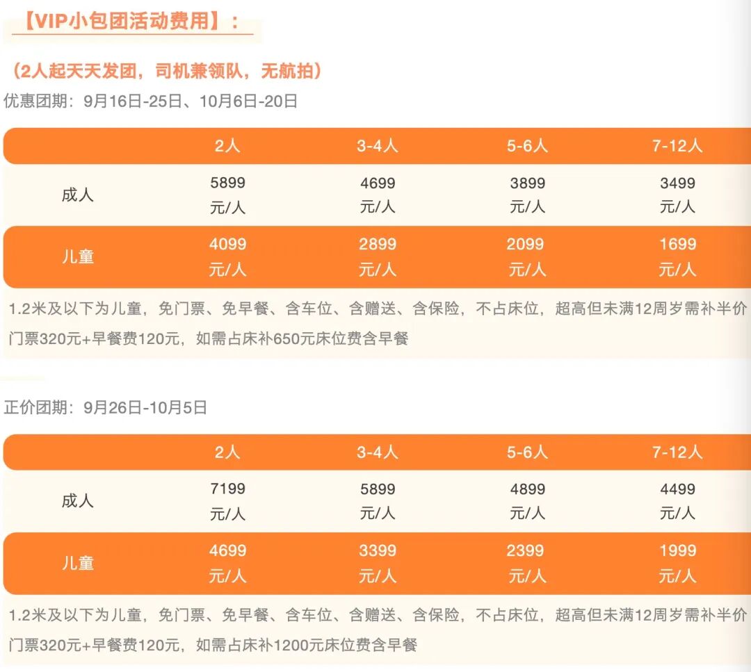 (1.2米及以下为儿童,免门票、免早餐、含车位、含领队、含保险、含赠送,不占床位,超高但未满12周岁需补半价门票320元+早餐费120元,如需占床正价团期补1200元床位费含早餐)