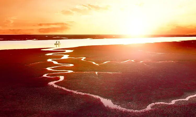 09:00抵达【盘锦红海滩】,这里是国家5A级风景区,每年秋天短暂的一个多月,这里都会聚集大量慕名而来的游客,红海滩是由漫无边际的碱蓬草形成;秋天来到以后碱蓬草呈现美丽的红色,对面便是辽阔的金色稻田,一红一黄呈现出动人的婀娜之姿。