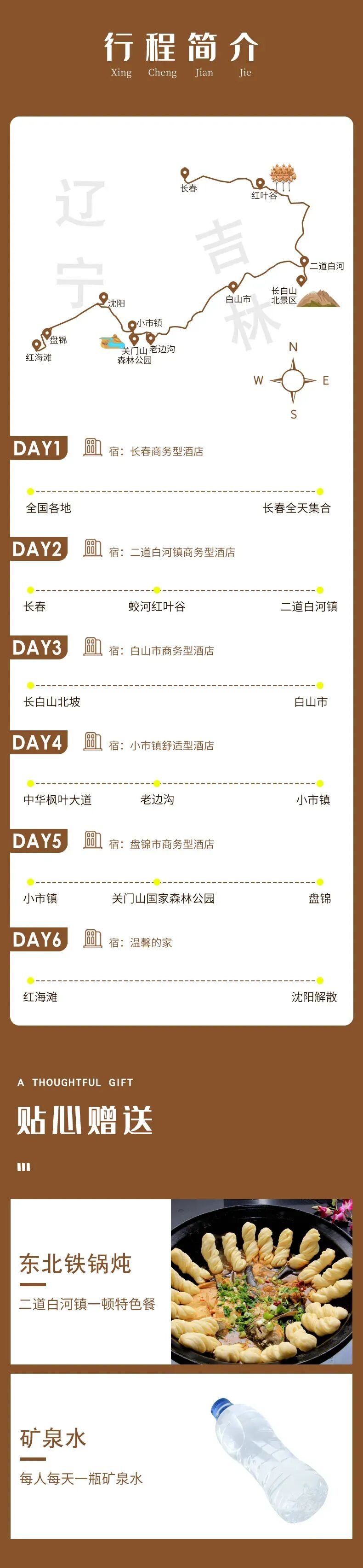 4.门票:蛟河红叶谷门票、长白山北坡门票+含环保车、老边沟门票、关门山国家森林公园门票+单程环保车、盘锦红海滩门票;