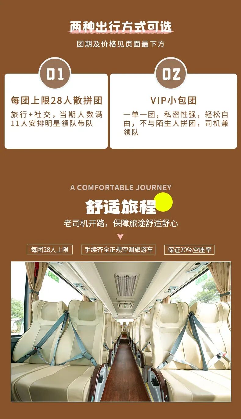 5.领队:当期满11人安排专职明星领队带队,不足人数为司机兼领队,司机可做简单讲解,不陪同进入景区;