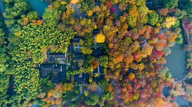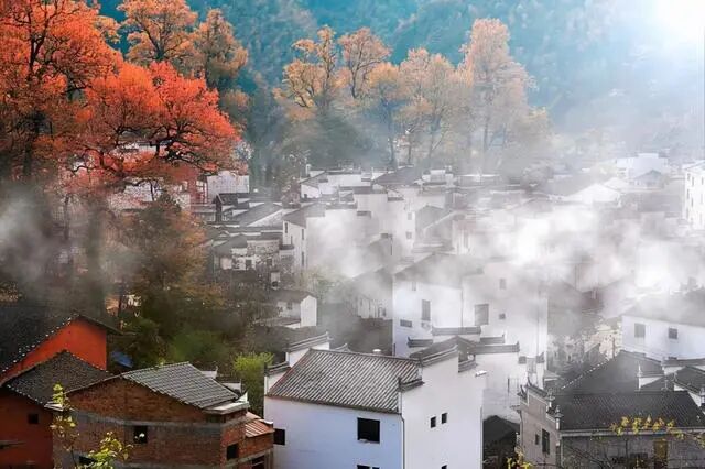 十一月的婺源,秋意正浓,白云深处的石城,丝丝薄雾飘在黑白民居之上,环绕着高大红枫,美得很不真实。