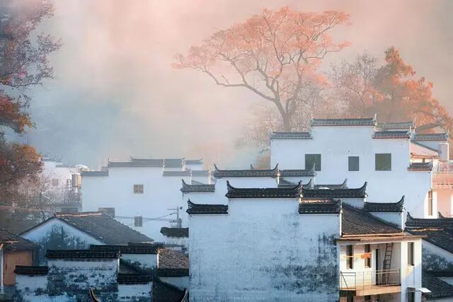 两村之间隔着一个小山坡,村后都有古枫点缀。被青石板古驿道贯穿整个村庄的叫戴村。而程村三面古枫树环抱,粉墙黛瓦的古民居在烟雾中若隐若现,很受摄影爱好者的青睐。