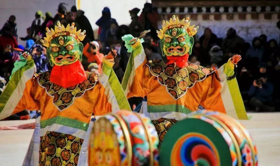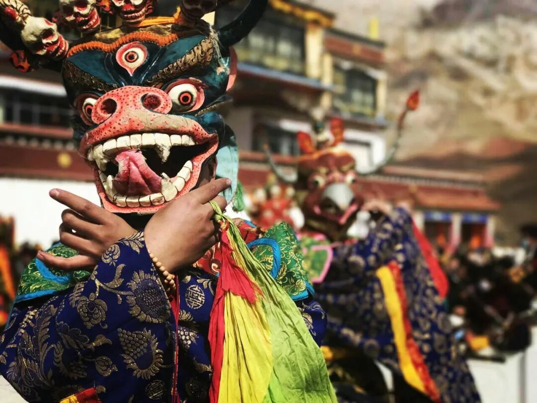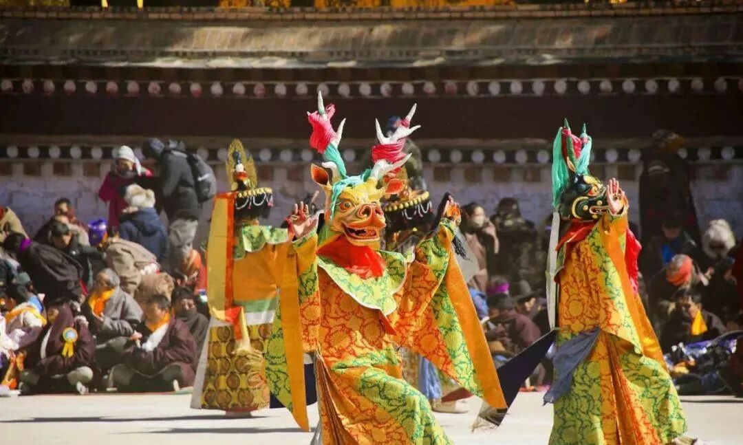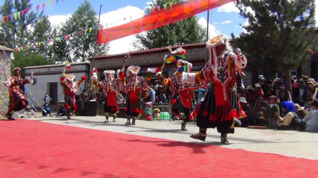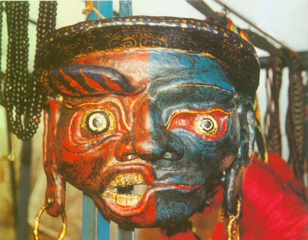 西藏宗教面具历史悠远,原始的信仰为这一特殊的文化现象提供了土壤。吐蕃先民认为,天上、地上、地下居住着各种鬼怪和神灵,它们掌握着大自然和人类的命运,只有通过对神灵的膜拜祭供,才能摆脱人生的苦难。在松赞干布时期,每年到了农业收成期时,都会举行一次比较大型的跳神活动。最开始是不戴面具的,各村会选出一个所谓‘通灵’的人,将他们组织在一起,就像现在望果节一样在田间地头跳舞,祈求神灵赐福于人间。