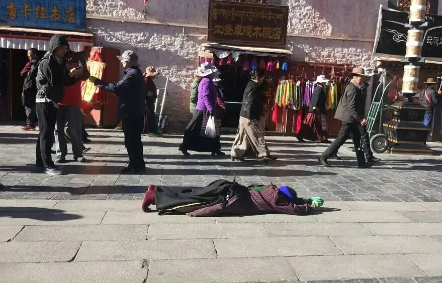 除此之外,还有于寺庙殿堂之内或外围,原地不断磕长头的形式,不同的只是不行步,其余的与行进中磕长头一样,常有磕十万长头者,这样才表示虔诚。另外,围绕着寺庙或神山圣湖的磕头朝圣方式较转经则更加虔诚,朝圣者亦是口诵佛经,三步一磕。