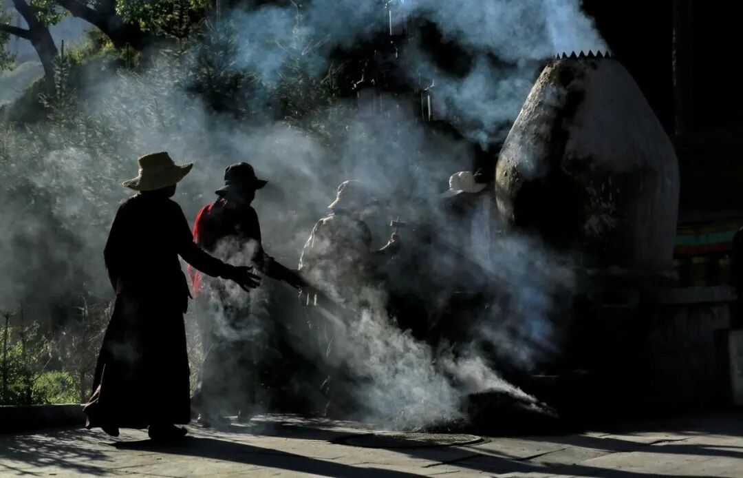 煨桑就是将松柏枝放入桑炉中焚烧,类似于汉族的烧香礼佛。在藏区的寺庙、垭口,包括普通民众的家中都备有桑炉,每逢藏历节日,人们起得很早,第一件事就是煨桑礼佛,据说在煨桑的过程中产生的烟雾不仅使凡人有舒适感,佛陀也会十分高兴,因而信徒们以此作为祈福的一种形式,希望佛会降福于敬奉他的人们。