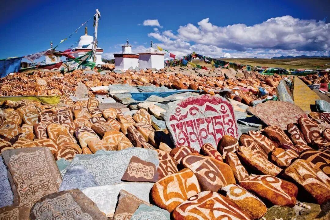 玛尼堆的藏语名为“多崩”,意为“十万经石”,是刻有经文和佛像的石头,以藏文六字真言最常见。在藏区广阔的土地上,每一处山口、圣迹、寺庙、湖边、路边都堆有玛尼堆。虔诚的佛教徒认为,把他们日夜默念的六字真言刻在石头上,能使他们洗刷此世的罪孽。