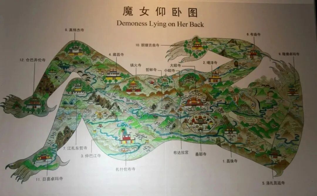 相传拉萨的地形如同一个仰卧的魔女,尼泊尔公主根据文成公主的推算,以山头驮土,填平卧塘湖,并在其上修建了大昭寺。供奉神像,镇住女魔鬼心骨。