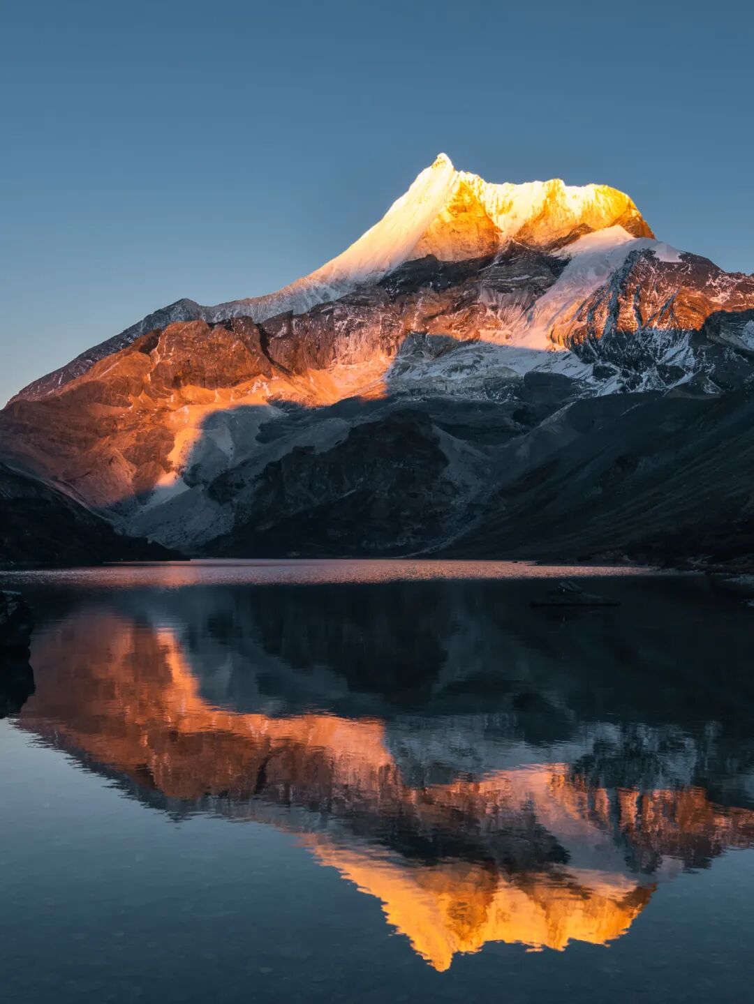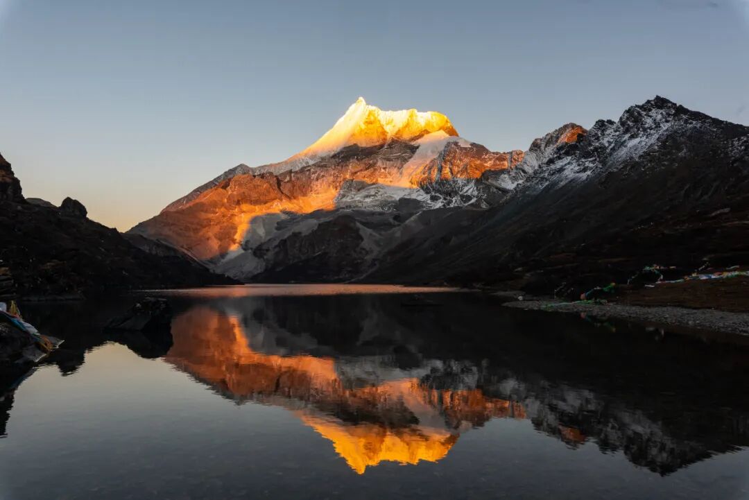 位于央迈勇雪山西坡的蛇湖,是由央迈勇的冰川融水与周边降水汇聚而成,是亚丁地区最大的海子之一,其湖水碧绿澄澈,宛如翡翠。黄昏时分隔湖而望,落日的余晖将雪山映衬为金黄色,如同一尊神佛倒影在湖面,美不胜收。
