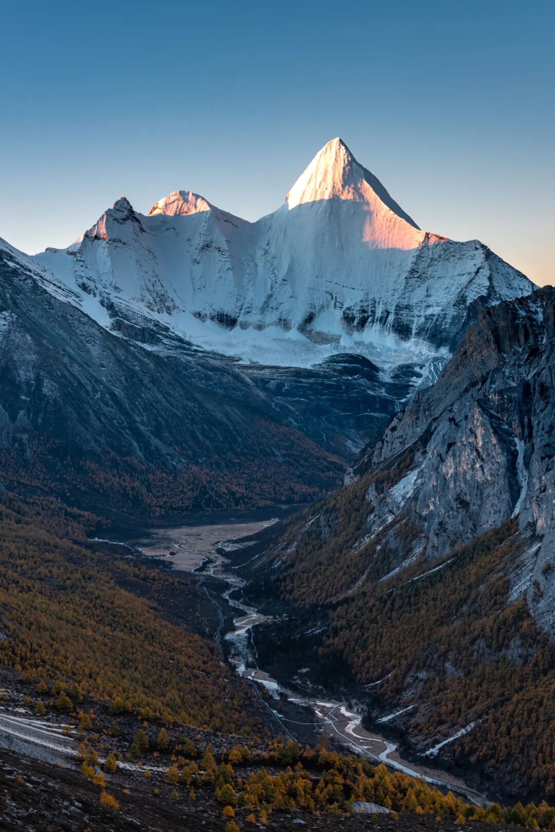 ▲十月下旬,亚丁景区内的彩林与央迈勇。