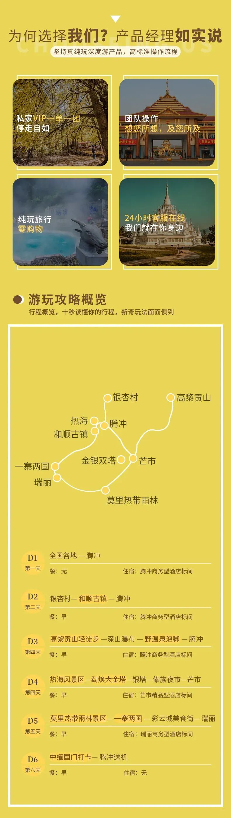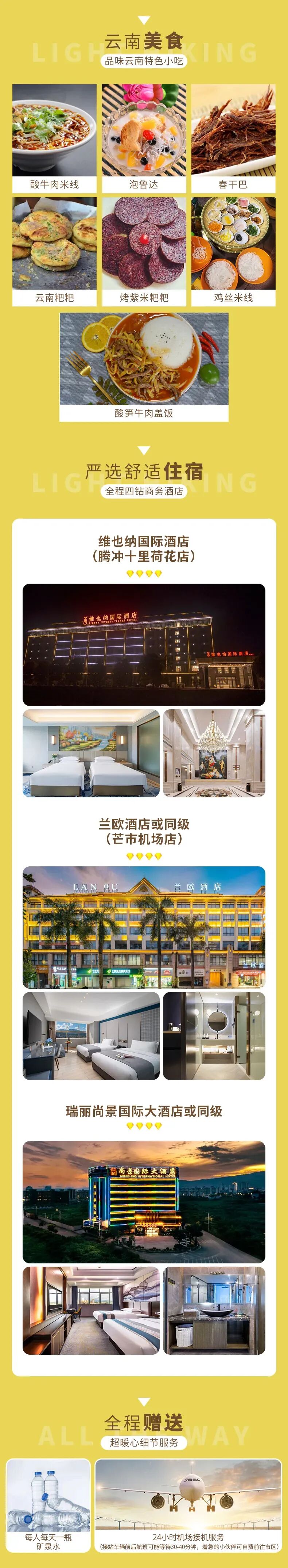 1.住宿:芒市商务型酒店1晚、瑞丽商务型酒店标间1晚、腾冲商务型酒店3晚