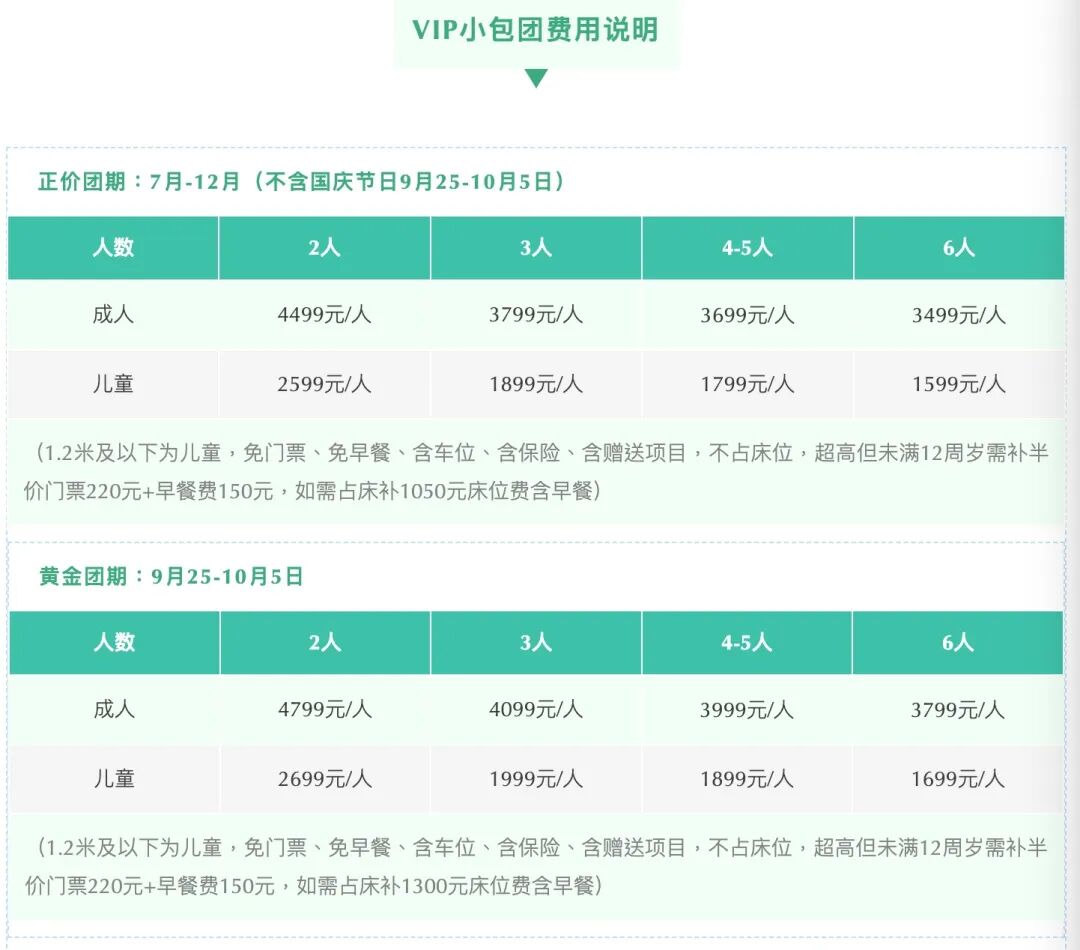 1.2米及以下为儿童,免门票、免早餐、含车位、含领队、含保险、含赠送项目,不占床位,超高但未满12周岁需补半价门票220元+早餐费150元,如需占床补1050元-1300元床位费含早餐